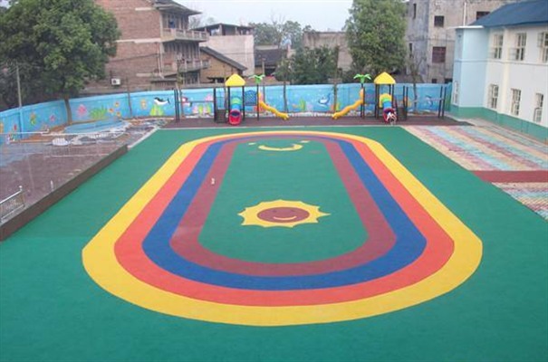 如果場地很寬的話,還可以做幾條小塑膠跑道,孩子們在上面玩的時候,可以組織他們來個小跑。場地超過500平方米,可以做成彎跑道,如果太小,只有300-500平方米,可以做3條左右的直跑道,再在邊上鋪設一些漂亮的圖案。