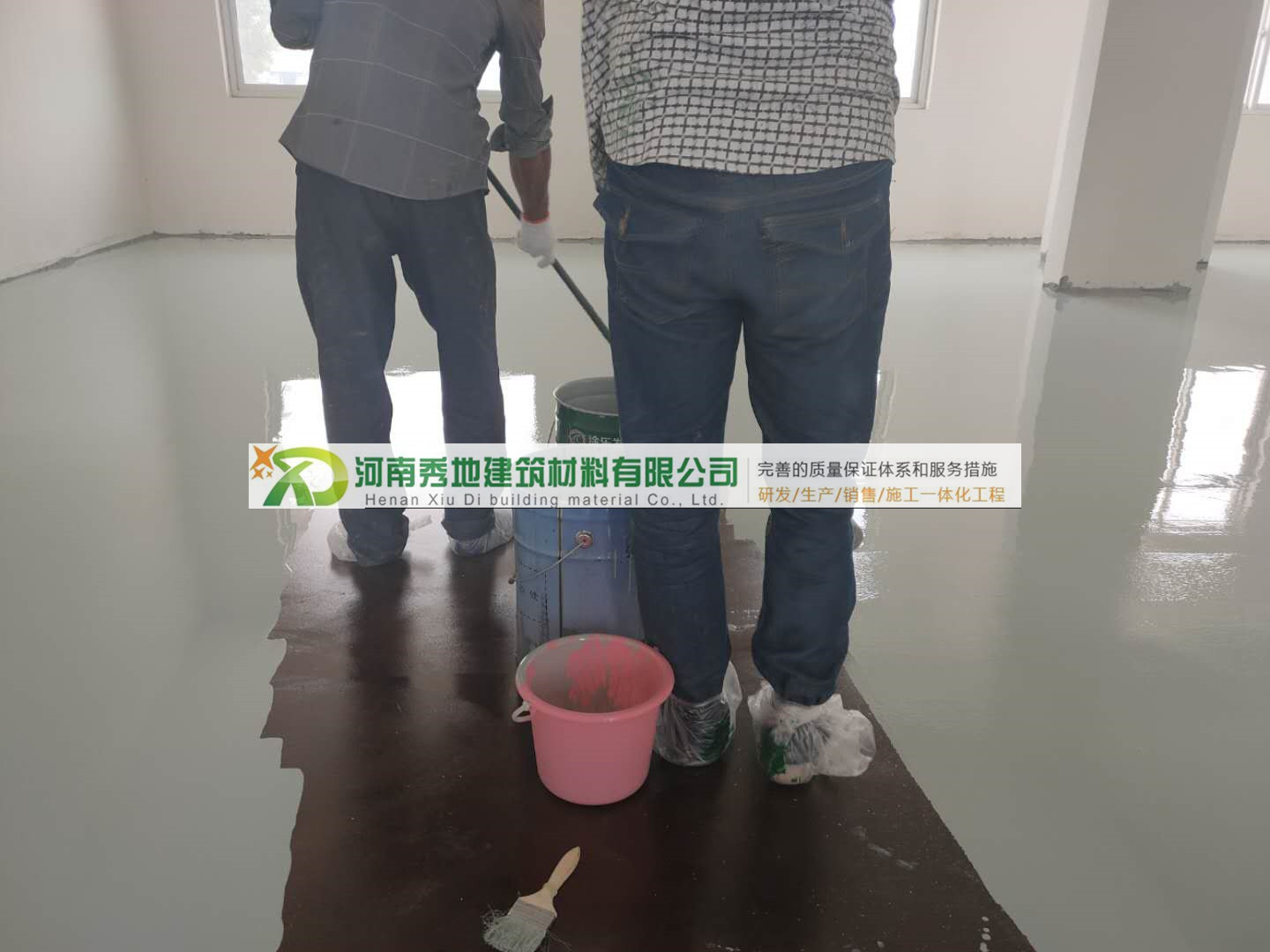 底漆按廠家規(guī)定配比,用電子稱計(jì)量好,混合之后充分?jǐn)嚢杈鶆蚝螅霉瓮炕蛘邼L涂的方式施工。底漆完全干燥后方可進(jìn)行下一工序施工(干燥時(shí)間和溫度、濕度關(guān)系大,溫度25度左右24小時(shí)后可進(jìn)行下一遍施工)。目的是增強(qiáng)地面和面層的附著力。